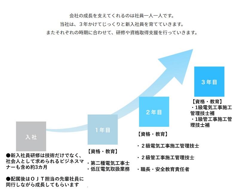 当社が独自に開発した研修カリキュラムで、3ヶ月の間に基本を繰り返し行うため、これだけで2種電気工事士の資格はたいてい全員が取得してきます。