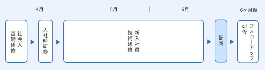 この研修コース終了後に部門配属するため、技術系では、配属先で直ちに必要となる基本スキルを身につけての配属となります。事務系では、当社の基本業務についてしっかりと理解した状態での配属となるため、仕事の意味や背景の理解が進みます。